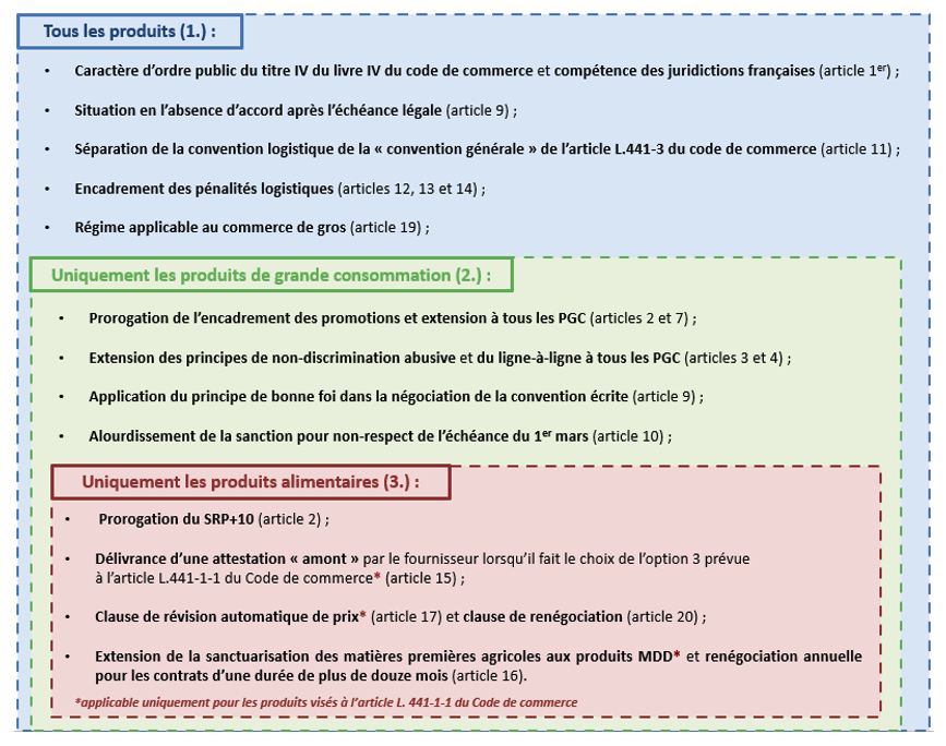 De nombreuses dispositions concernent tous les produits confondus c’est-à-dire les produits alimentaires comme non‑alimentaires, les produits de grande consommation comme ceux ne répondant pas à cette qualification.