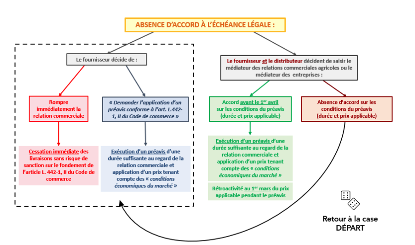 | Que prévoit ce dispositif expérimental ? 1° En cas de désaccord persistant à l’échéance légale, la possibilité est laissée au fournisseur de choisir entre : soit, rompre immédiatement les relations commerciales sans pour autant se trouver dans l’illégalité puisqu’il ne pourra pas se voir sanctionné sur le fondement de la rupture brutale de relations commerciales établies (art. L. 442-1, II C. com) dans ce cas ; soit, « demander l’application d’un préavis conforme [à l’article L. 442-1, II du Code de commerce] ».Bien que la formulation soit quelque peu maladroite, nous comprenons ici qu’il s’agit ainsi d’éviter le risque de déréférencement. 2° Les parties peuvent également saisir le médiateur des relations commerciales agricoles ou le médiateur des entreprises afin de conclure, sous son égide et avant le 1er avril, un accord sur les conditions de ce préavis (durée et prix applicable). En cas de succès de la médiation, le prix convenu s’appliquera rétroactivement au 1er mars et pendant la durée du préavis convenu. En cas d’échec de la médiation, fournisseur et distributeur se retrouveront, ni plus ni moins, à la case départ puisque le fournisseur aura alors le choix entre : rompre immédiatement la relation commerciale, sans craindre de se voir sanctionner sur le fondement de la rupture brutale de relations commerciales établies (art. L. 442-1, II C. com) ou ; « demander l’application d’un préavis conforme [à l’article L. 442-1, II du Code de commerce] ». Schématiquement, ce dispositif expérimental peut se présenter comme suit : |