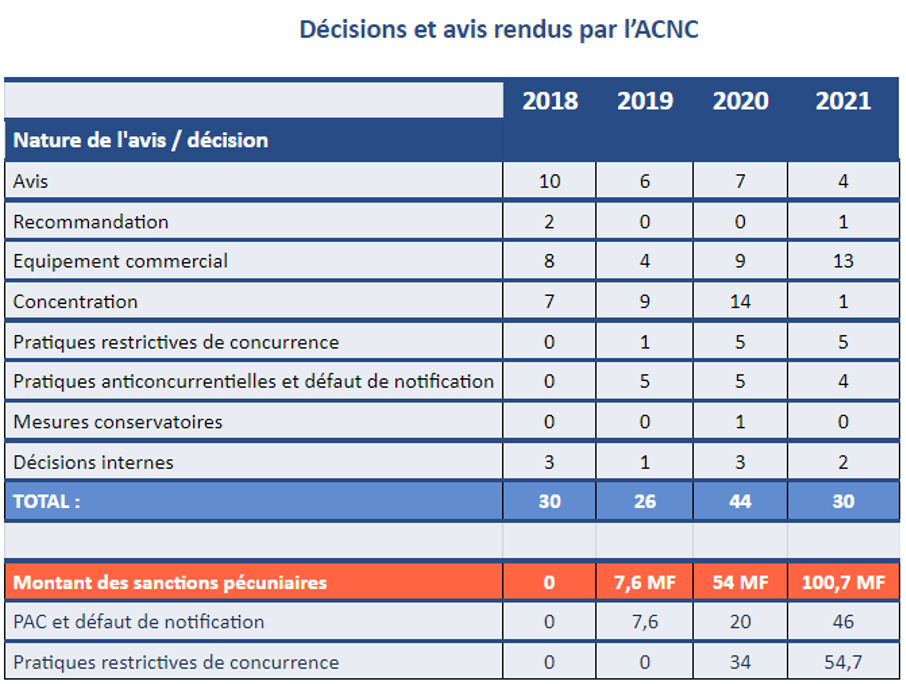 Tableau des décisions rendues chaque année par l’ACNC publié sur le site institutionnel.